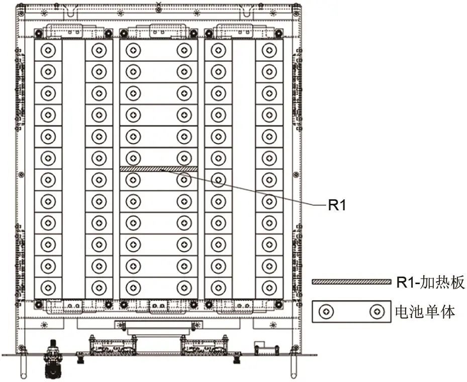 如圖7所示,采用加熱板安裝在電池模組中間,同時(shí)加熱兩個(gè)電池單體,加熱裝置宜選用平面狀,長寬尺寸與電池單體接近,且與電池直接接觸,功率500~1200 W,電池箱內(nèi)設(shè)置電磁點(diǎn)火裝置,溫度數(shù)據(jù)采集頻率10 Hz。
