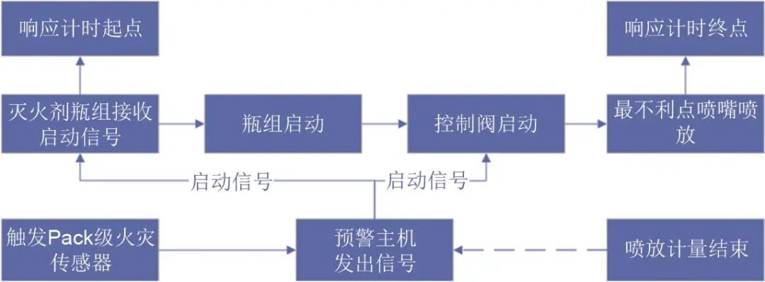測試動(dòng)作流程如圖6所示,當(dāng)布置在Pack級內(nèi)的傳感器感應(yīng)到電池發(fā)生溫度異常時(shí),由預(yù)警主機(jī)接收感應(yīng)信號并進(jìn)行判定。預(yù)警主機(jī)根據(jù)所設(shè)定的程序向滅火劑瓶組和控制閥發(fā)出啟動(dòng)信號,滅火劑瓶組啟動(dòng),通過主管道和分管道達(dá)到指定噴嘴位置釋放滅火劑直至明火撲滅。