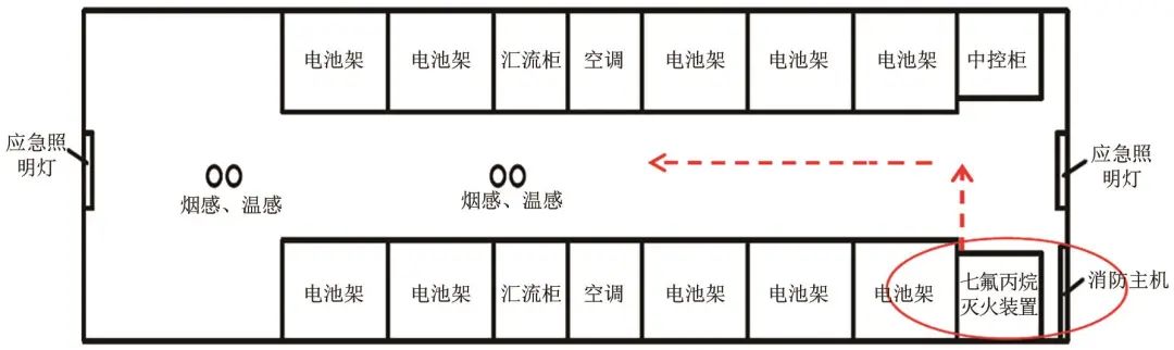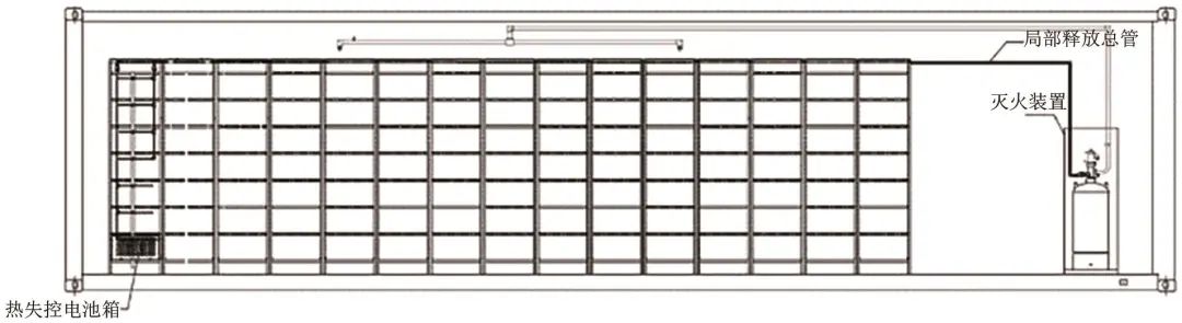 為了驗(yàn)證所開發(fā)的靶向消防裝備對鋰離子電池火災(zāi)的效果,本工作搭建了1∶1全尺寸實(shí)驗(yàn)平臺(tái)。具體測試方法參考2.2節(jié)噴放功能測試,具體技術(shù)要求和測試方法可參考T/CIAPS0015—2022團(tuán)體標(biāo)準(zhǔn)《預(yù)制艙式鋰離子電池儲(chǔ)能系統(tǒng)火災(zāi)抑制裝置測試方法》。根據(jù)應(yīng)用場景,所設(shè)計(jì)的裝置火災(zāi)抑制試驗(yàn)空間容積為40尺標(biāo)準(zhǔn)集裝箱,選取1個(gè)100%荷電狀態(tài)(SOC)的電池模組,安裝在電池箱內(nèi),電池單體容量為80 Ah,電池Pack容量不小于8 kWh,電池單體及模組之間根據(jù)實(shí)際工況串并聯(lián),在集裝箱內(nèi)布置方式如圖5所示。