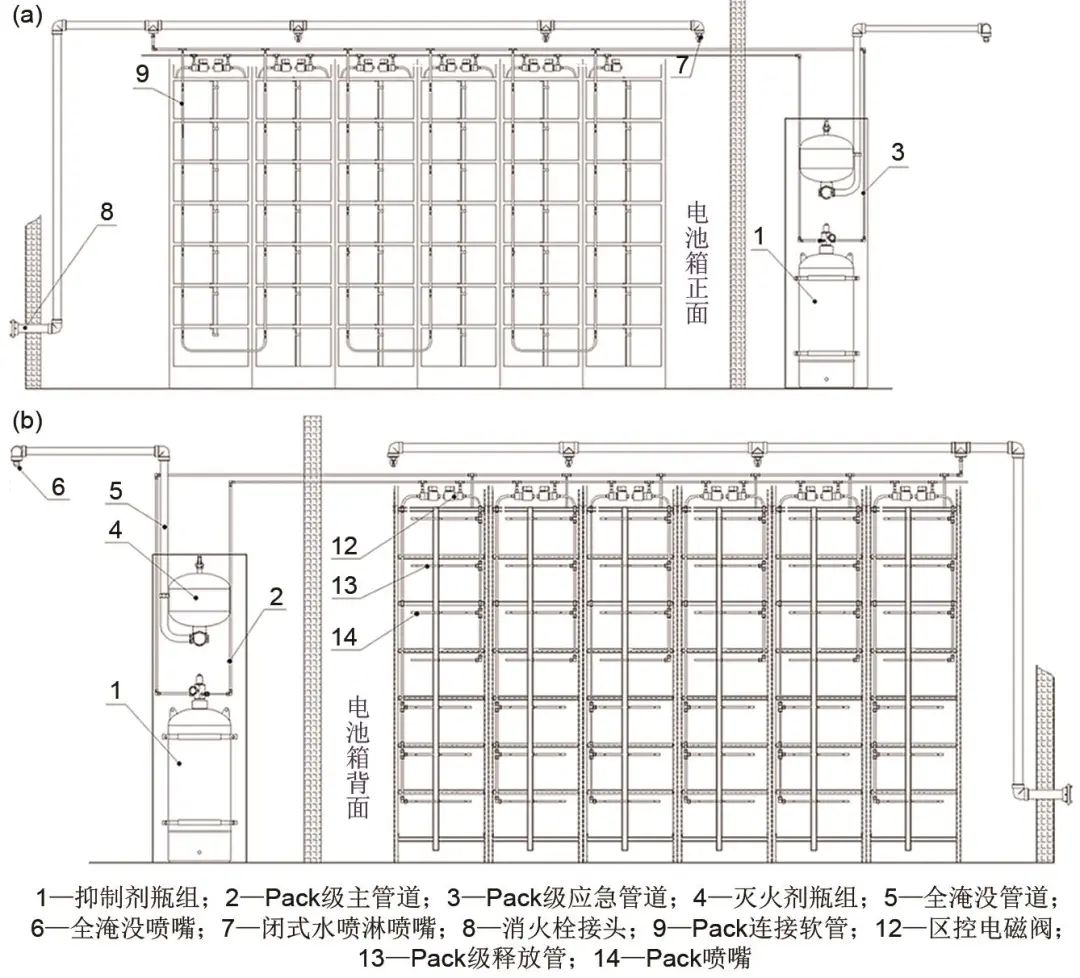 摘 要 鋰電池儲(chǔ)能系統(tǒng)是構(gòu)建新型電力系統(tǒng),實(shí)現(xiàn)雙碳戰(zhàn)略目標(biāo)的關(guān)鍵支撐,但鋰離子電池儲(chǔ)能系統(tǒng)的消防安全問題成為了制約儲(chǔ)能系統(tǒng)大規(guī)模推廣的關(guān)鍵瓶頸,現(xiàn)有基于固定建筑物式的傳統(tǒng)氣體滅火系統(tǒng)適用性不強(qiáng),無法撲滅鋰離子電池火災(zāi)及抑制復(fù)燃。本工作面向典型預(yù)制艙式鋰離子電池儲(chǔ)能系統(tǒng),基于多層協(xié)同預(yù)警技術(shù)和不同防護(hù)滅火策略實(shí)現(xiàn)了對儲(chǔ)能系統(tǒng)的靶向消防防控裝備開發(fā)。首先,基于煙/溫感探測器、可燃?xì)怏w傳感器、Pack溫度傳感器構(gòu)建了多層協(xié)同的預(yù)警技術(shù),實(shí)現(xiàn)對電氣火災(zāi)、鋰離子電池火災(zāi)的精準(zhǔn)預(yù)警。其次,在現(xiàn)有七氟丙烷滅火系統(tǒng)基礎(chǔ)上增加鋰電池火災(zāi)專用抑制系統(tǒng),滿足國標(biāo)電氣場所消防設(shè)計(jì)要求的同時(shí)保障鋰電池火災(zāi)抑制需求。通過主管道、應(yīng)急管道、噴嘴的布局定位安裝,所設(shè)計(jì)的抑制系統(tǒng)支持Pack級主動(dòng)防護(hù),能將鋰離子電池抑制劑輸送到Pack,實(shí)現(xiàn)對鋰離子電池火災(zāi)的早期撲滅并能多次啟動(dòng),抑制鋰離子電池火災(zāi)復(fù)燃及蔓延。滅火系統(tǒng)和抑制系統(tǒng)協(xié)同作戰(zhàn),各自發(fā)揮優(yōu)勢,全方位保障鋰離子電池儲(chǔ)能系統(tǒng)的安全。