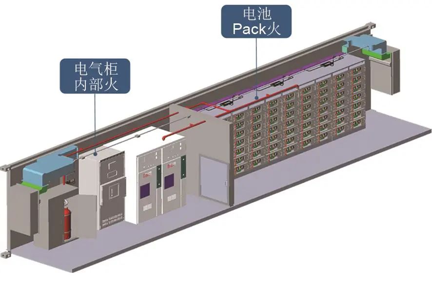 因此針對電化學(xué)儲(chǔ)能系統(tǒng),結(jié)合儲(chǔ)能系統(tǒng)結(jié)構(gòu)特點(diǎn)研發(fā)一種高效率且結(jié)構(gòu)和布局設(shè)計(jì)合理的滅火裝置迫在眉睫。本工作基于鋰離子電池儲(chǔ)能系統(tǒng)預(yù)制艙結(jié)構(gòu)特點(diǎn),構(gòu)建了多層協(xié)同預(yù)警技術(shù),實(shí)現(xiàn)對電氣火災(zāi)、電池火災(zāi)的精準(zhǔn)火災(zāi)預(yù)警。參考現(xiàn)有消防建設(shè)標(biāo)準(zhǔn)的基礎(chǔ)上,在現(xiàn)有七氟丙烷滅火系統(tǒng)基礎(chǔ)上增加鋰離子電池火災(zāi)抑制系統(tǒng),通過抑制系統(tǒng)中的Pack級釋放管道布置及時(shí)將全氟己酮滅火劑輸送至熱失控Pack,實(shí)現(xiàn)對熱失控電池的精準(zhǔn)防控,防止電池火災(zāi)蔓延。滅火系統(tǒng)和抑制系統(tǒng)協(xié)同作戰(zhàn),發(fā)揮各自優(yōu)勢,全面保障電化學(xué)儲(chǔ)能系統(tǒng)安全運(yùn)行。