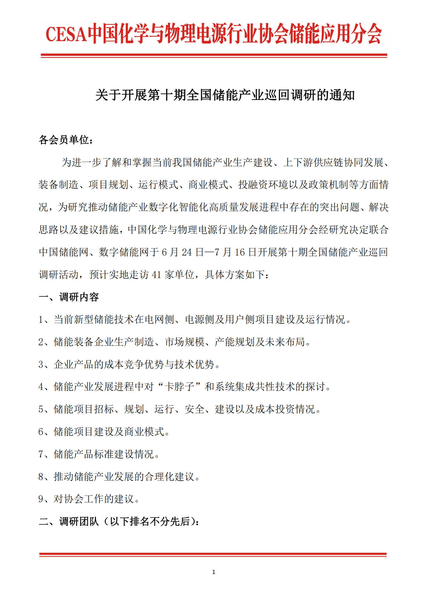 為進(jìn)一步了解和掌握當(dāng)前我國儲能產(chǎn)業(yè)生產(chǎn)建設(shè)、上下游供應(yīng)鏈協(xié)同發(fā)展、裝備制造、項(xiàng)目規(guī)劃、運(yùn)行模式、商業(yè)模式、投融資環(huán)境以及政策機(jī)制等方面情況,為研究推動儲能產(chǎn)業(yè)數(shù)字化智能化高質(zhì)量發(fā)展進(jìn)程中存在的突出問題、解決思路以及建議措施,中國化學(xué)與物理電源行業(yè)協(xié)會儲能應(yīng)用分會經(jīng)研究決定聯(lián)合中國儲能網(wǎng)、中國儲能網(wǎng)于6月24日—7月16日開展第十期全國儲能產(chǎn)業(yè)巡回調(diào)研活動,預(yù)計(jì)實(shí)地走訪41家單位,具體方案如下: