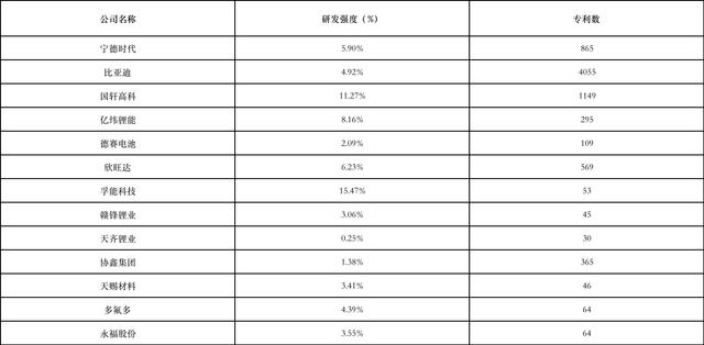 表1 “電池供應鏈”賽道企業(yè)研發(fā)強度和專利數