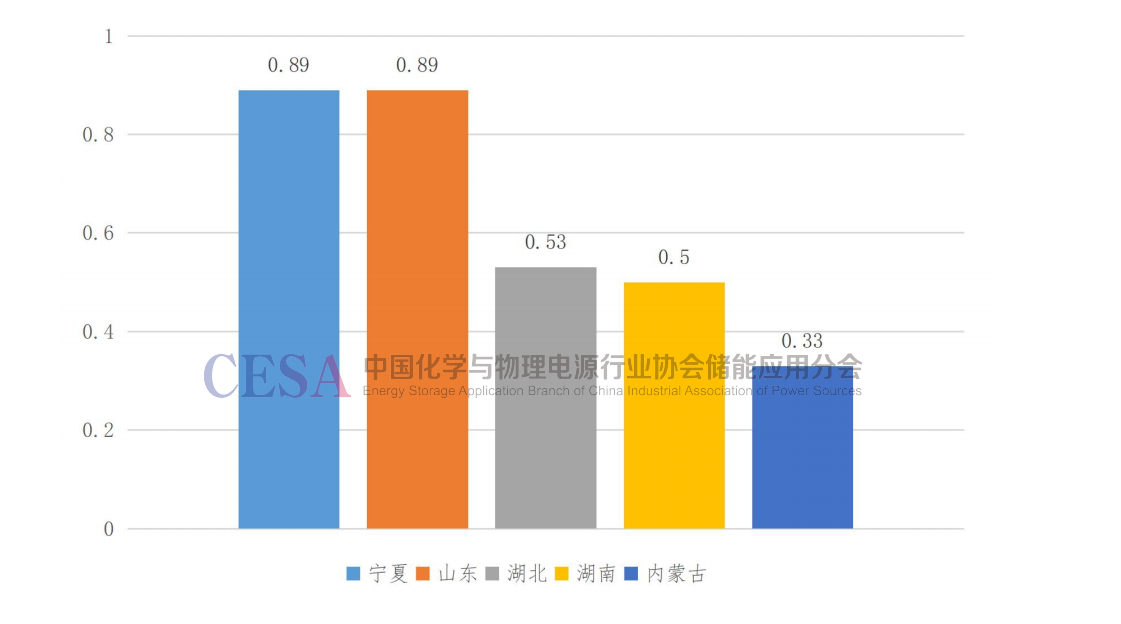 2022年新增裝機規(guī)模排名前5名的省份為:寧夏、山東、湖北、湖南和內(nèi)蒙古,新增裝機容量分別為0.89GW、0.89GW、0.53GW、0.50GW和0.33GW。