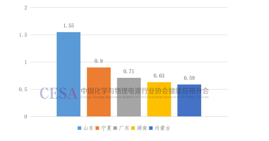8.2022年底山東、寧夏、廣東、湖南和內(nèi)蒙古累計新型儲能裝機規(guī)模排名前5