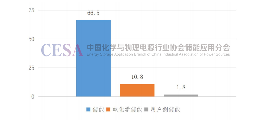 2022年中國儲能累計裝機功率為66.5GW,其中電化學儲能累計裝機功率約為10.8GW。用戶側儲能累計裝機功率約為1.8GW。
