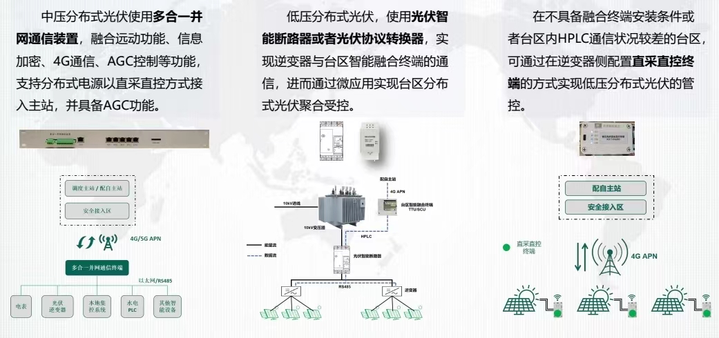 通過交易系統(tǒng)解決綠電需求,在調(diào)控聚合方面,除了管控系統(tǒng)我們也研發(fā)應用了性價比高的各監(jiān)測控制點的終端裝置,在在10KV并網(wǎng)點和低壓區(qū)域分布式光伏聚合并網(wǎng)點加裝多合一并網(wǎng)終端,能夠正確接收并自動執(zhí)行調(diào)度、配自主站下發(fā)的指令,對逆變器、PLC、本地集控系統(tǒng)等進行調(diào)節(jié),從而實現(xiàn)AGC子站功能。