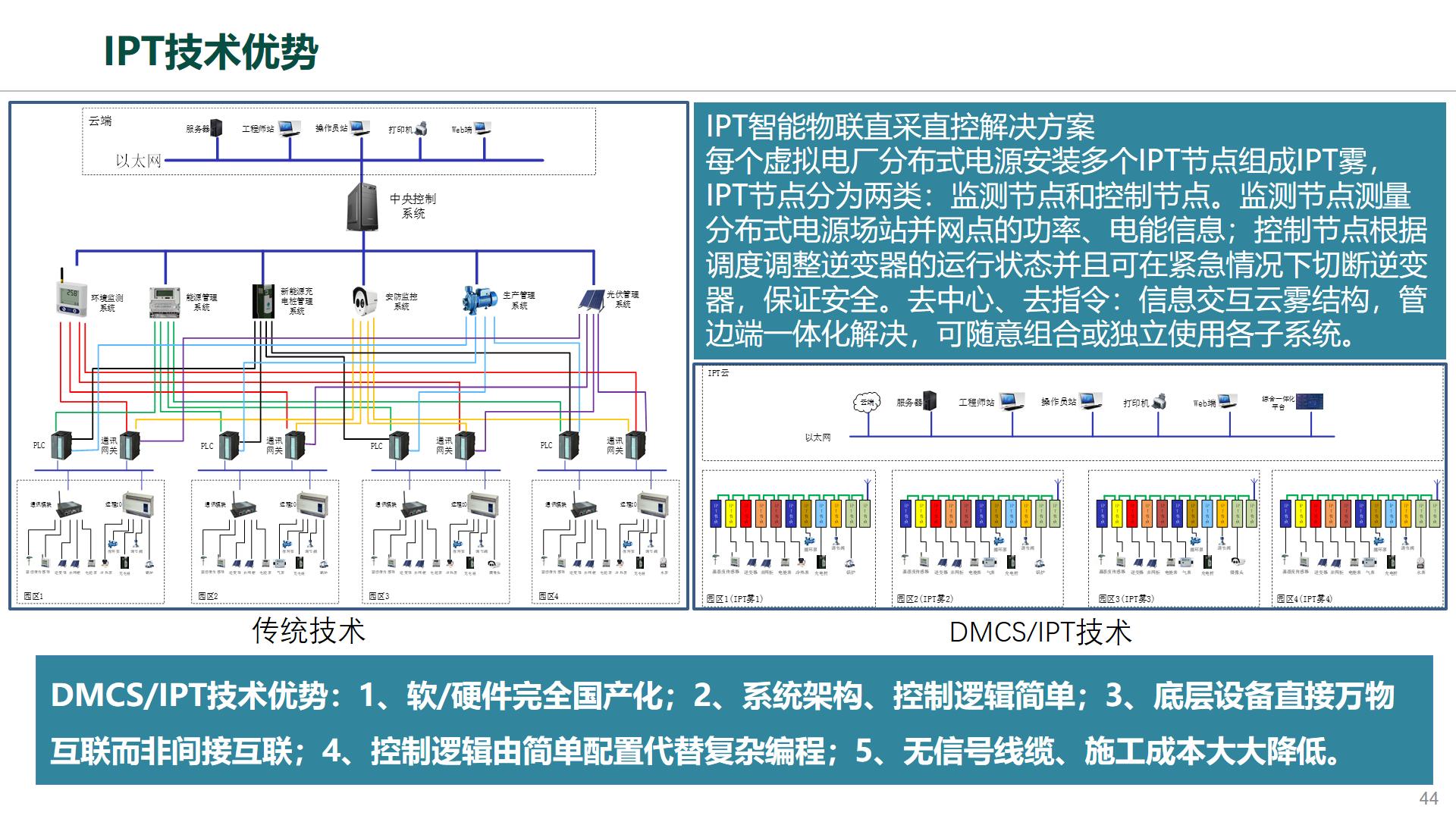 落實雙碳目標離不開分布式光伏監(jiān)控,在光伏臺區(qū)通過現(xiàn)有“二合一”融合終端加裝IPT霧網(wǎng)絡(luò)分布式智能測控節(jié)點裝置,導軌式安裝香煙盒大小,完全分布式的方案,監(jiān)控各個設(shè)備的運行互不干擾,信息的交互按照指定的測控周期進行,最小測控周期可達毫秒級別,完全滿足時效性要求,性價比高真正實現(xiàn)萬物互聯(lián),在增量臺區(qū)可以與現(xiàn)有融合終端作為內(nèi)嵌模塊升級為“三合一”實現(xiàn)存量、增量分布式光伏的全覆蓋,對下仍采用“融合終端-智能電表-逆變器”模式。IPT裝置還可以應用在用戶能耗監(jiān)測、綜合能源、新型負荷管理、配電自動化等業(yè)務(wù)領(lǐng)域。