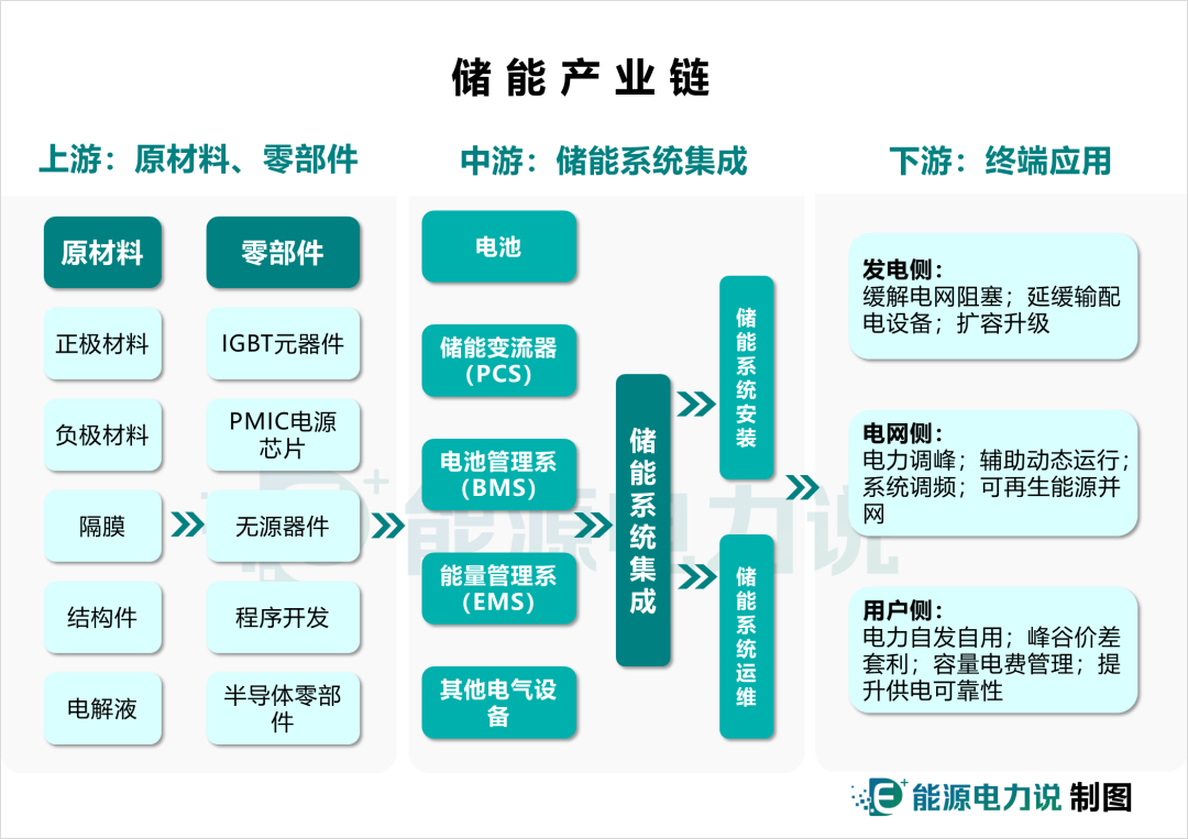 中國儲能網(wǎng)訊:從電化學儲能系統(tǒng)產(chǎn)業(yè)鏈來看,上游是電池原材料、電子元器件供應商等;中游是儲能系統(tǒng)集成;下游應用端則是風光電站、電網(wǎng)系統(tǒng)、戶用/工商業(yè)、通信運營商、數(shù)據(jù)中心等終端用戶。一個典型的電化學儲能系統(tǒng)主要由電池、儲能變流器(PCS)、電池管理系統(tǒng)(BMS)、能量管理系統(tǒng)(EMS)四個核心部分構成。