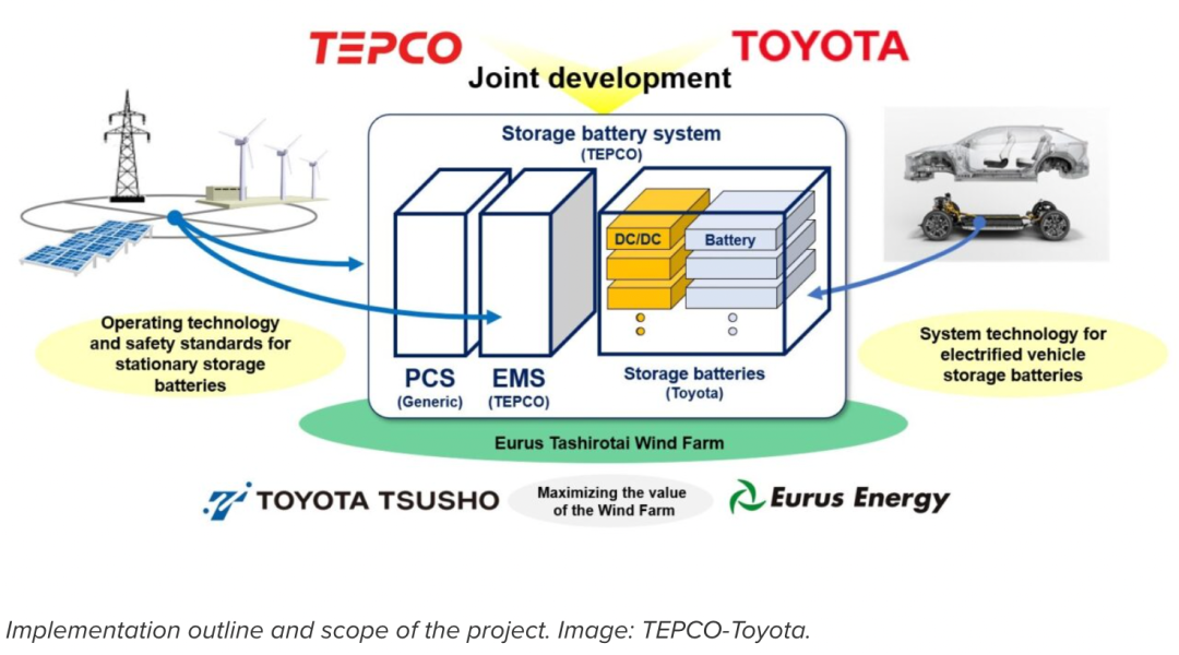 豐田和東京電力公司旨在利用該項目為能源服務應用開發(fā)存儲系統(tǒng),并隨著可再生能源份額的增長平衡電網(wǎng)電力的供需。這個利用回收電動汽車電池的BESS解決方案可以與今天市場上已經(jīng)存在的電力轉換系統(tǒng)(PCS)連接,并使用多個堆疊電池單元。