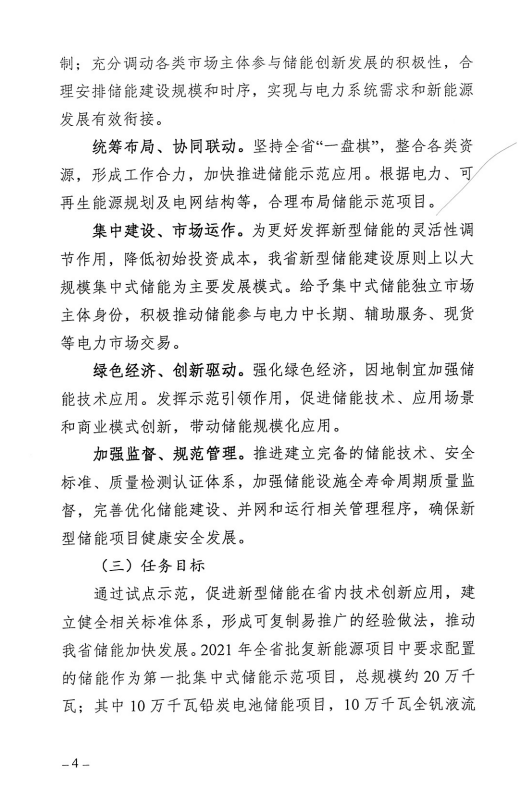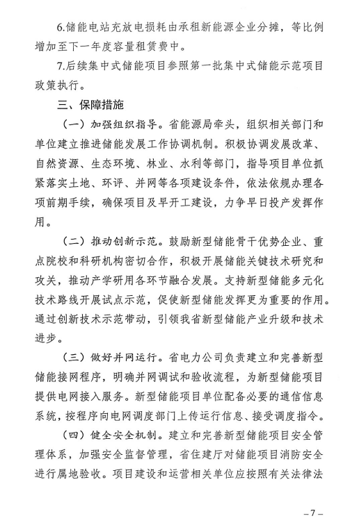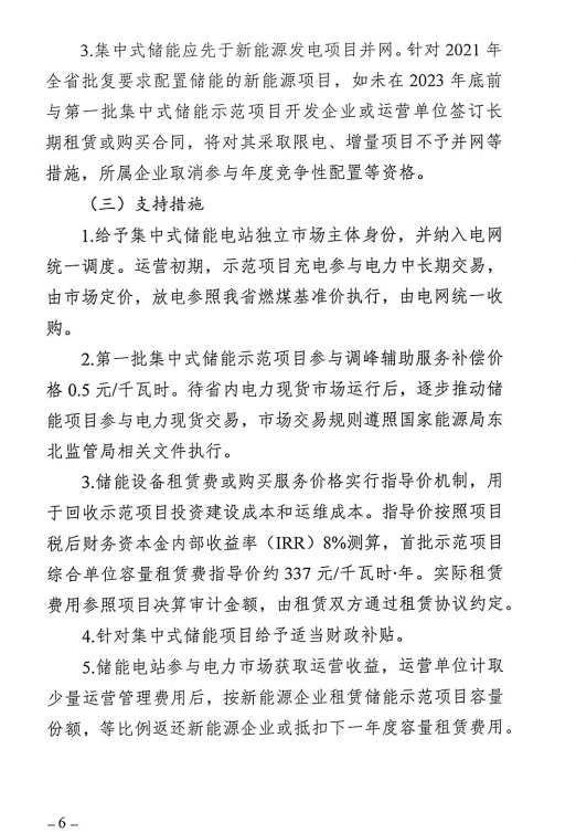 并網(wǎng)方面,集中式儲能應(yīng)先于新能源發(fā)電項目并網(wǎng)。針對 2021 年全省批復(fù)要求配置儲能的新能源項目,如未在 2023 年底前與第一批集中式儲能示范項目開發(fā)企業(yè)或運營單位簽訂長期租賃或購買合同,將對其采取限電、增量項目不予并網(wǎng)等措施,所屬企業(yè)取消參與年度競爭性配置等資格。
