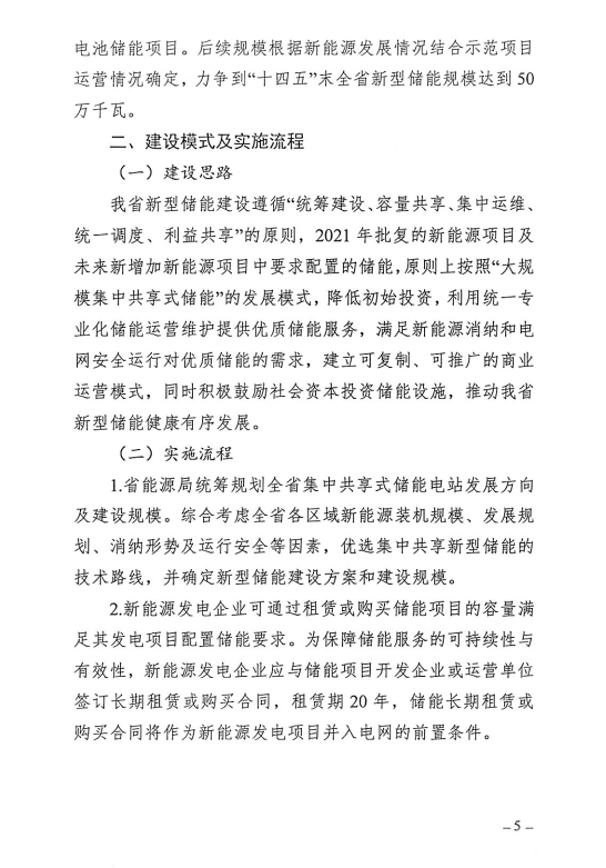 該方案明確了新型儲能建設(shè)遵循“統(tǒng)籌建設(shè)、容量共享、集中運維、統(tǒng)一調(diào)度、利益共享”的原則,2021 年批復(fù)的新能源項目及未來新增加新能源項目中要求配置的儲能,原則上按照“大規(guī)模集中共享式儲能”的發(fā)展模式,降低初始投資。