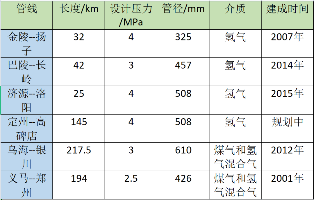 氫氣管道分為工業(yè)管道、長輸管道、公用管道和專用管道。工業(yè)管道用于制氫、冶金、電子、建材、電力、化工等企業(yè)內(nèi)輸送氫氣;長輸管道用于遠距離集中輸送氫氣;公用管道是指城鎮(zhèn)氫氣管道;專用管道是指加氫站、氫燃料電池汽車供氫系統(tǒng)、氫安全試驗設備等的氫氣管道。氫氣管道具有種類多、管徑和壓力范圍大、量大面廣等特點。目前,歐美地區(qū)已建成多條氫氣長輸管線,總長度逾5 000 km。相比之下,我國雖然在氫氣工業(yè)管道、專用管道方面積累了較為豐富的管道設計、施工、運行和維護經(jīng)驗,但氫氣長輸管道建設起步較晚,總里程約500 km, 詳細情況見表1。