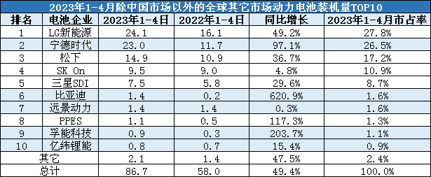 中國儲能網訊:機構數據顯示,2023年1-4月,除中國市場以外的全球其它市場動力電池裝機量為86.7GWh,同比增長49.4%。