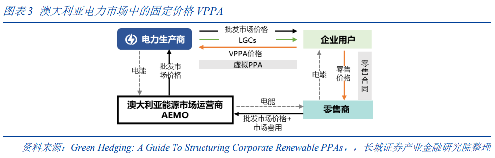 澳大利亞電力市場中主要有兩種VPPA:固定價格VPPA和變動價格VPPA(通常部分為固定價格,部分以批發(fā)市場現(xiàn)貨價格)。這些合約主要是針對特定可再生能源項目的部分電力和LGC(綠證),但購買方不直接從發(fā)電方購買電力,而是從售電商購買。