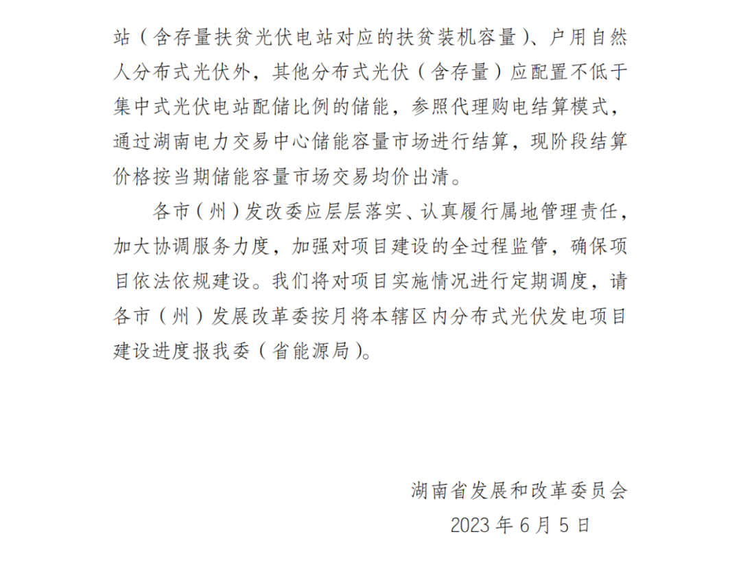 除鄉(xiāng)村振興村級光伏電站(含存量扶貧光伏電站對應(yīng)的扶貧裝機容量)、戶用自然人分布式光伏外,其他分布式光伏(含存量)應(yīng)配置不低于集中式光伏電站配儲比例的儲能,參照代理購電結(jié)算模式,通過湖南電力交易中心儲能容量市場進行結(jié)算,現(xiàn)階段結(jié)算價格按當期儲能容量市場交易均價出清。
