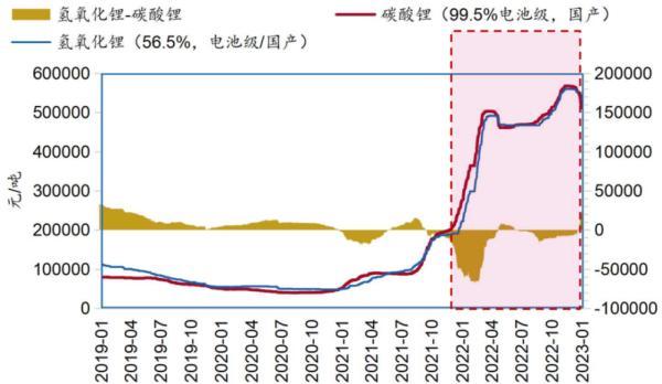 可以看到,在當(dāng)初簽訂合同的2022年2月9日,碳酸鋰價(jià)格在當(dāng)年元旦站上30萬(wàn)元/噸之后開(kāi)啟跳漲模式,2月中旬沖上40萬(wàn)元/噸,并在3月初突破50萬(wàn)元/噸大關(guān),較年初上漲近7成。對(duì)比2021年年初5.5萬(wàn)元/噸的低價(jià)更是直接暴漲8倍,漲幅高達(dá)809%。2022年11月底,碳酸鋰價(jià)格更是漲到了58萬(wàn)元/噸的歷史最高位點(diǎn)。