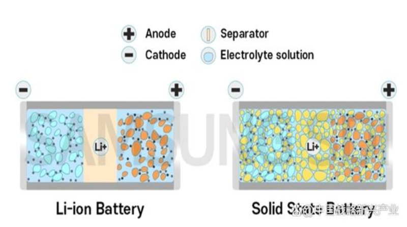商業(yè)上使用的鋰離子電池有一個(gè)隔板,用液體電解質(zhì)溶液將陰極和陽(yáng)極分開。而在固態(tài)電池中,正極、負(fù)極和固態(tài)電解質(zhì)被連續(xù)堆疊在一起,形成一個(gè)固定的單元。具有固體電解質(zhì)的固態(tài)電池顯示出更高的穩(wěn)定性和固體結(jié)構(gòu),提高了安全性。