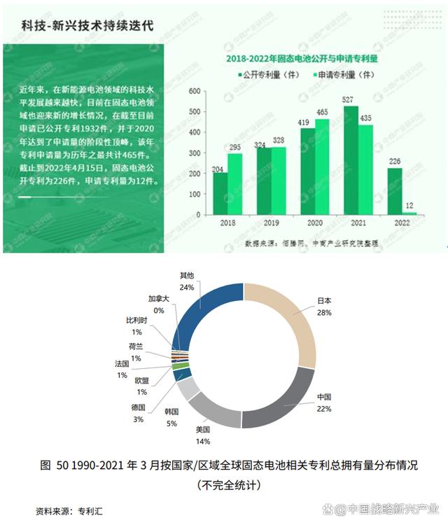 新能源電池領(lǐng)域的科技水平發(fā)展越來(lái)越快,目前在固態(tài)電池領(lǐng)域也迎來(lái)新的增長(zhǎng)情況,申請(qǐng)已公開專利1932件,并于2020年達(dá)到了申請(qǐng)量的階段性頂峰,該年專利申請(qǐng)量為歷年之最共計(jì)465件。截止2022年4月15日,固態(tài)電池公開專利為226件,申請(qǐng)專利量為12件。