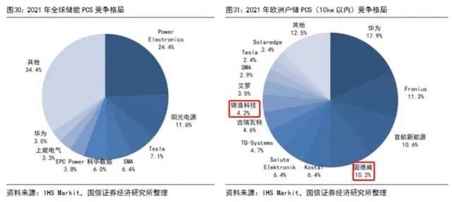 國信證券研報指出,歐洲戶儲PCS方面,華為17.9%份額位居第一,國內(nèi)企業(yè)首航新能源,固德威,古瑞瓦特,錦浪科技均在前十。隨著錦浪科技、固德威、德業(yè)股份等國內(nèi)企業(yè)在儲能變流器中的生產(chǎn)、渠道布局建設加速,預計國產(chǎn)儲能PCS企業(yè)在全球市場份額將提升。