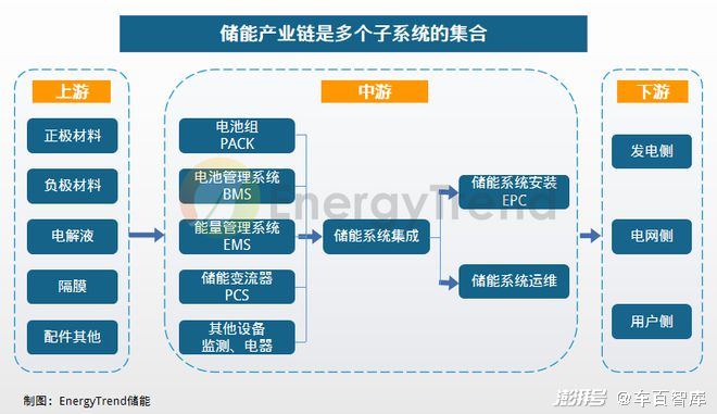 具體來看,鋰電池儲能產(chǎn)業(yè)鏈一般有三個環(huán)節(jié),從上游設(shè)備商、中游系統(tǒng)集成商再到下游應用端。儲能項目的建設(shè)流程一般是應用端對儲能項目進行招標,系統(tǒng)集成商去競標,電池企業(yè)再向集成商提供儲能電池。