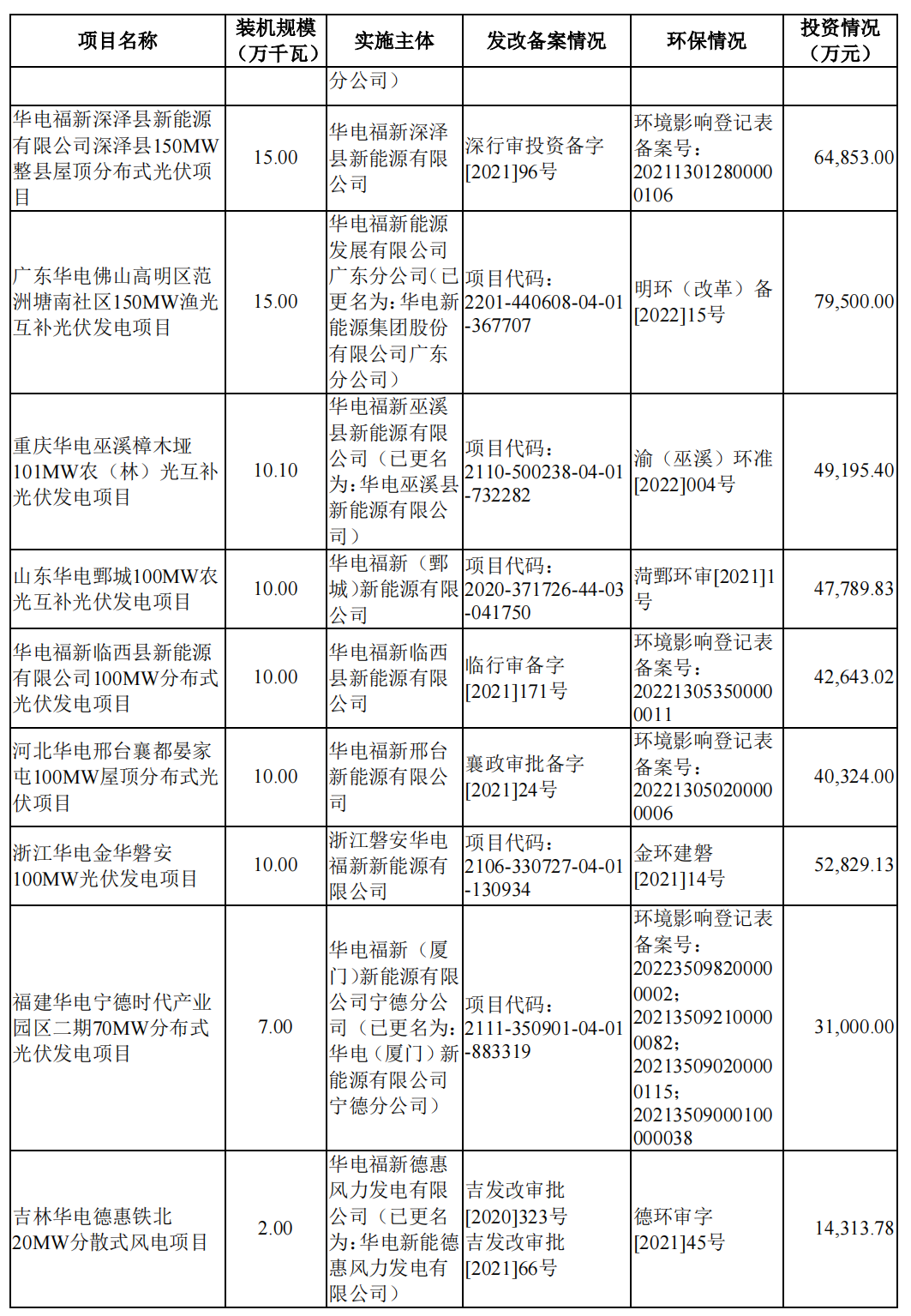 華電新能源在中東部負(fù)荷中心及周邊地區(qū)開發(fā)建設(shè)分散式風(fēng)電和分布式光伏,充分發(fā)揮負(fù)荷中心就地生產(chǎn)就地消納特色,積極探索光伏與其他產(chǎn)業(yè)的融合,布局光伏復(fù)合以及整縣光伏等“就地消納負(fù)荷中心項(xiàng)目”,項(xiàng)目平均資本金凈利潤率為 11.24%,平均投資回收期(稅后)為 13.00 年,具體項(xiàng)目如下表。