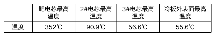 根據(jù)現(xiàn)場監(jiān)控?cái)?shù)據(jù)顯示,熱失控那顆電芯最高溫度達(dá)到了352度,而相鄰的2#電芯過程最高溫度為90.9℃,3#電芯過程最高溫度為56.6℃,冷板外表面最高溫度為55.6℃。