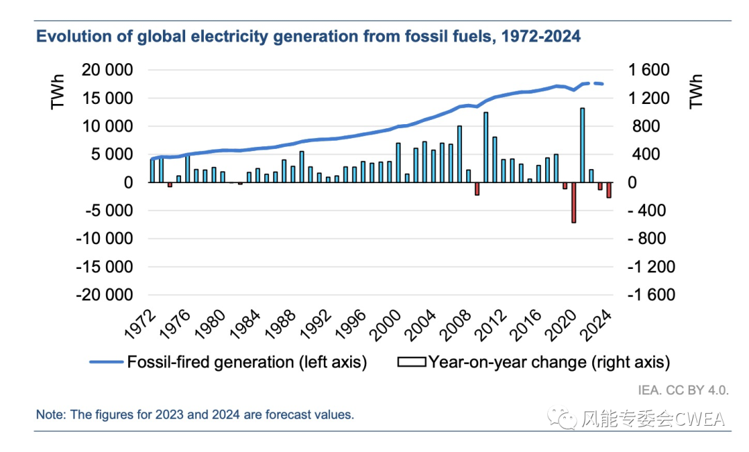 IEA表示,能源轉(zhuǎn)型正在形成的另一個(gè)跡象是,在2019年至2024年的六年中,化石燃料發(fā)電量有四年出現(xiàn)下降。過去,化石燃料發(fā)電量持續(xù)幾年下降的情況非常罕見,主要發(fā)生在全球能源和金融危機(jī)之后,因?yàn)楫?dāng)時(shí)全球的電力需求受到嚴(yán)重抑制。但近些年來,即使電力需求在不斷增長(zhǎng),化石燃料發(fā)電量也不會(huì)同步增長(zhǎng),反而會(huì)出現(xiàn)下降。