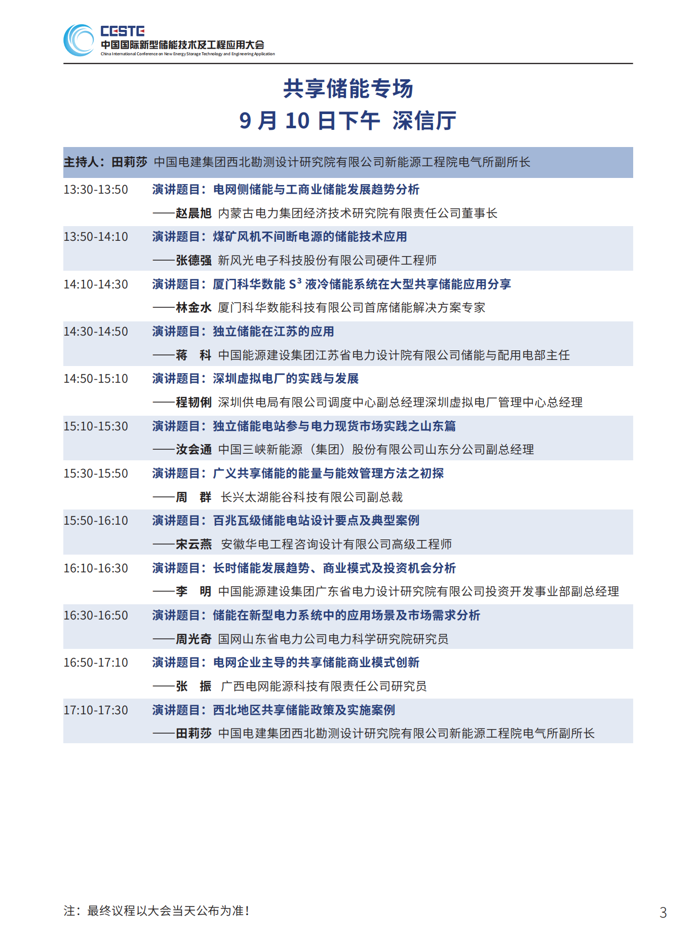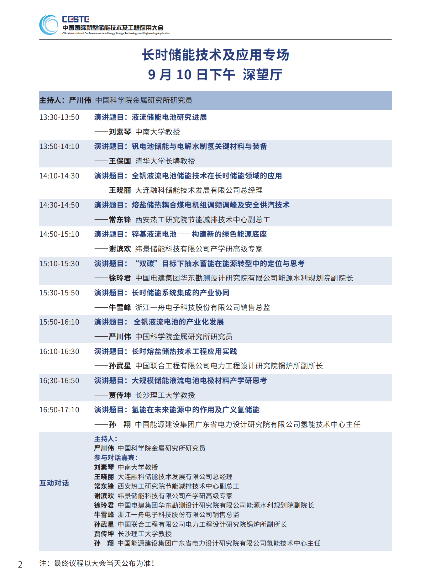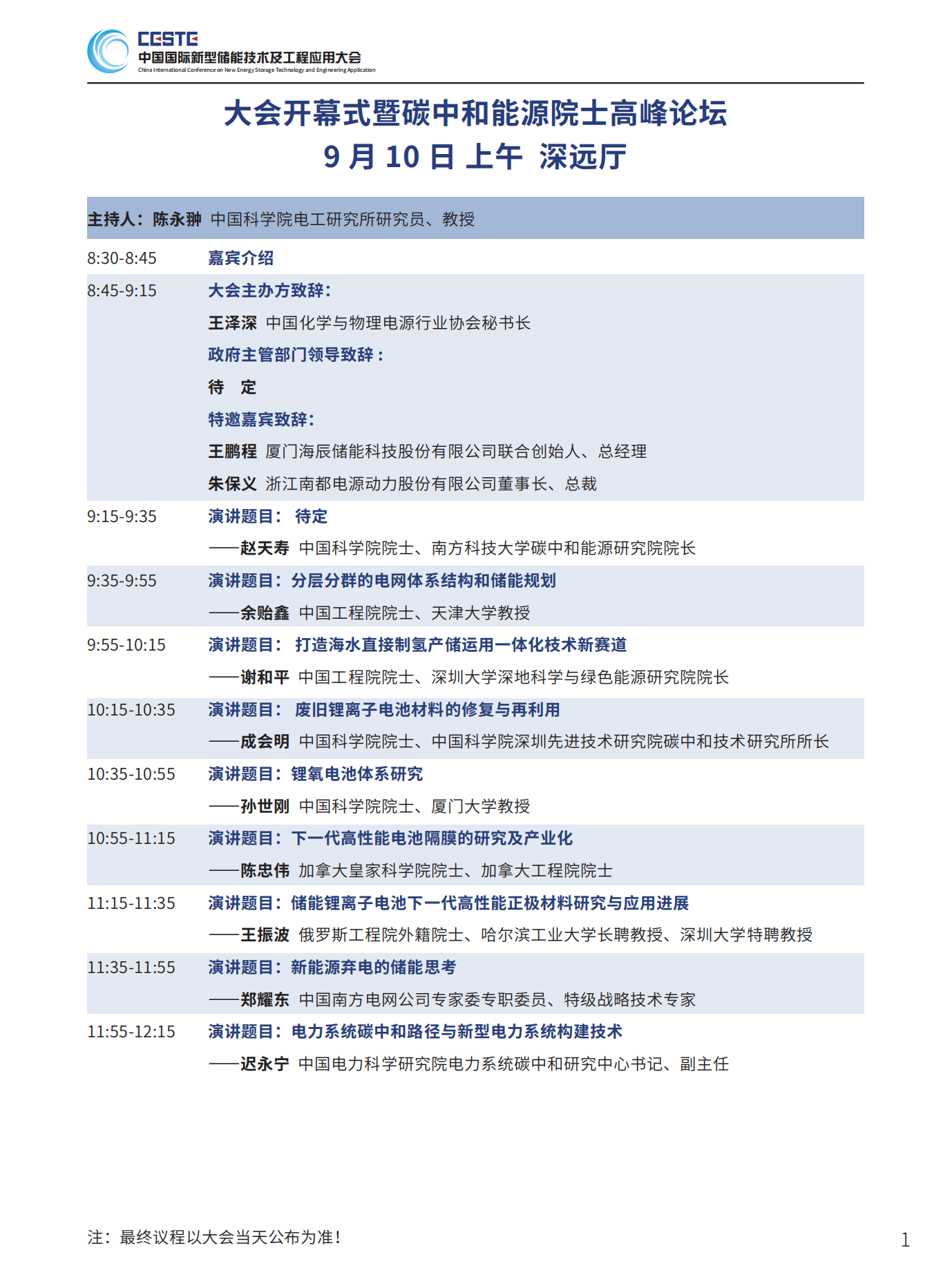 中國儲能網(wǎng)訊:由中國化學(xué)與物理電源行業(yè)協(xié)會決定聯(lián)合南方科技大學(xué)碳中和能源研究院、南方電網(wǎng)能源發(fā)展研究院等儲能領(lǐng)域的100余家單位共同支持的“碳中和能源院士高峰論壇暨第三屆中國國際新型儲能技術(shù)及工程應(yīng)用大會”將于2023年9月10-11日在深圳鵬瑞萊佛士酒店召開,以下為大會議程(最終議程以大會當(dāng)天公布為準(zhǔn))。