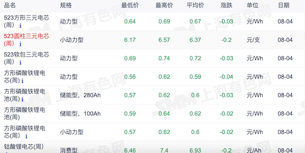 根據(jù)上海有色網(wǎng)(SMM)數(shù)據(jù),8月4日,方形磷酸鐵鋰電芯(動力型)的報價在0.56元/Wh~0.62元/Wh,均價在0.59元/Wh;523方形三元電芯的報價在0.64元/Wh~0.69元/Wh,均價在0.67元/Wh。