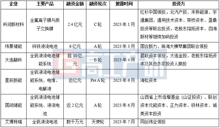 2023年以來液流電池產(chǎn)業(yè)鏈企業(yè)融資統(tǒng)計(jì)