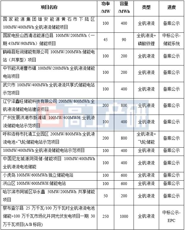 2023年以來液流電池備案及中標(biāo)項(xiàng)目統(tǒng)計(jì)