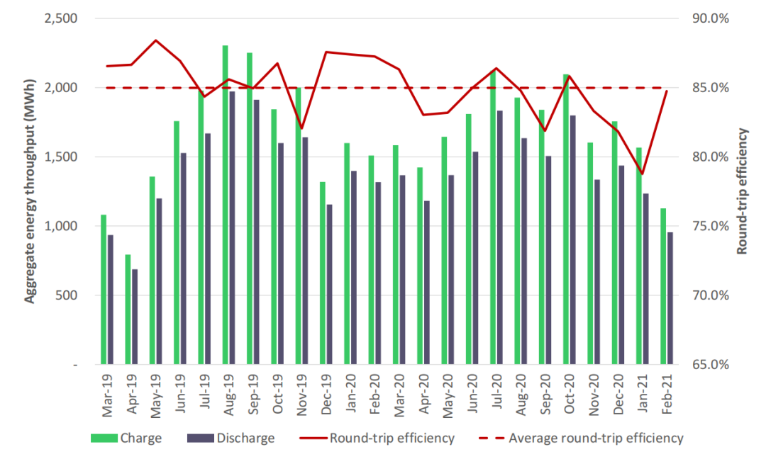如圖 8 所示,截至 2020 年 8 月的 6 個(gè)月期間,GESS 的平均往返效率為 84.9%,截至 2021 年 2 月的 6 個(gè)月期間,平均往返效率為 82.8%,在約 79-86% 之間波動(dòng)。請(qǐng)注意,此往返效率計(jì)算是在設(shè)施收益表上根據(jù)觀察到的市場(chǎng)購(gòu)買和出售的總能源(即總排放/總充電)進(jìn)行的。因此,它包含系統(tǒng)損失余額,并且未針對(duì) MLF 進(jìn)行調(diào)整。這是一種與正式性能測(cè)試不同且更近似的計(jì)算,正式性能測(cè)試將規(guī)定標(biāo)準(zhǔn)測(cè)試條件,包括充電和放電的額定功率以及充電和放電之間的定義時(shí)間段。