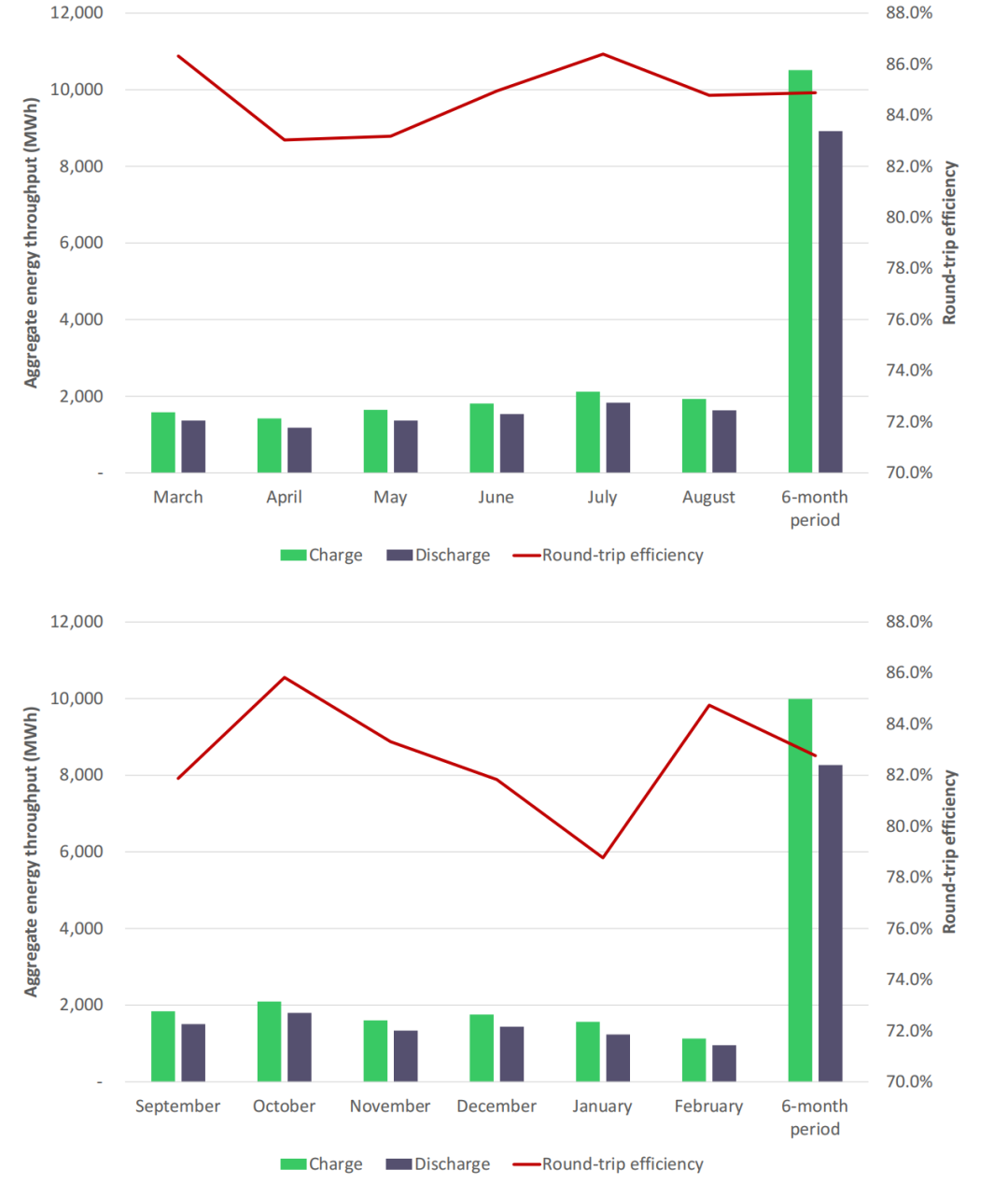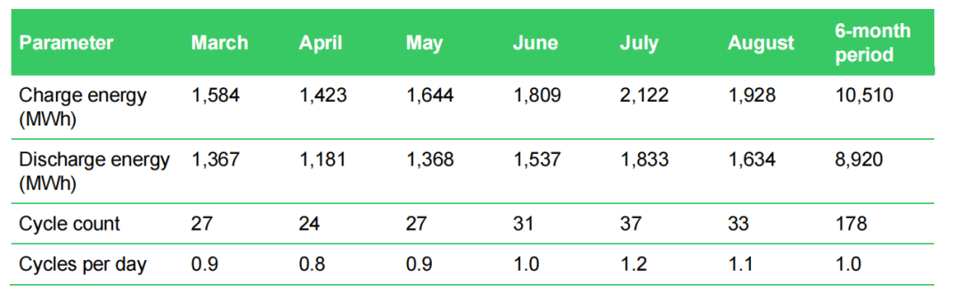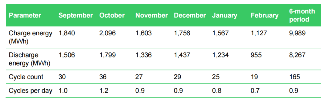自 3 月初以來,GESS 平均每天運(yùn)行一個(gè)循環(huán),截至 2020 年 8 月的 6 個(gè)月內(nèi),總充電能量為 10,510 MWh,放電能量為 8,920 MWh,6 個(gè)月內(nèi)分別為 9,989 MWh 和 8,267 MWh。截至 2021 年 2 月的一個(gè)月。與前一年類似,進(jìn)入夏季的肩季觀察到了最大的循環(huán)行為。表 7 總結(jié)了截至 2020 年 8 月的 6 個(gè)月期間的充電和放電循環(huán)結(jié)果,表 8 總結(jié)了截至 2021 年 2 月的 6 個(gè)月期間。