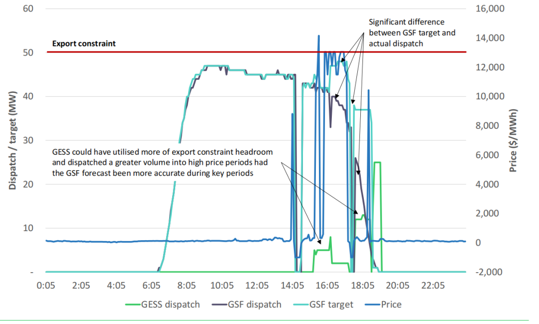 2019 年 3 月 1 日強(qiáng)調(diào)的問題(下圖 7),即太陽能預(yù)測(cè)的不準(zhǔn)確降低了 GESS 的調(diào)度效率,從而導(dǎo)致收入損失,但在報(bào)告期內(nèi)沒有再次出現(xiàn)。由于報(bào)告期內(nèi)波動(dòng)性保持在最低限度,僅觀察到三個(gè)交易區(qū)間的價(jià)格高于 1,000 美元/MWh,所有這些都發(fā)生在太陽能發(fā)電場(chǎng) 0MW 輸出期間。