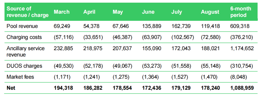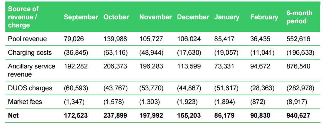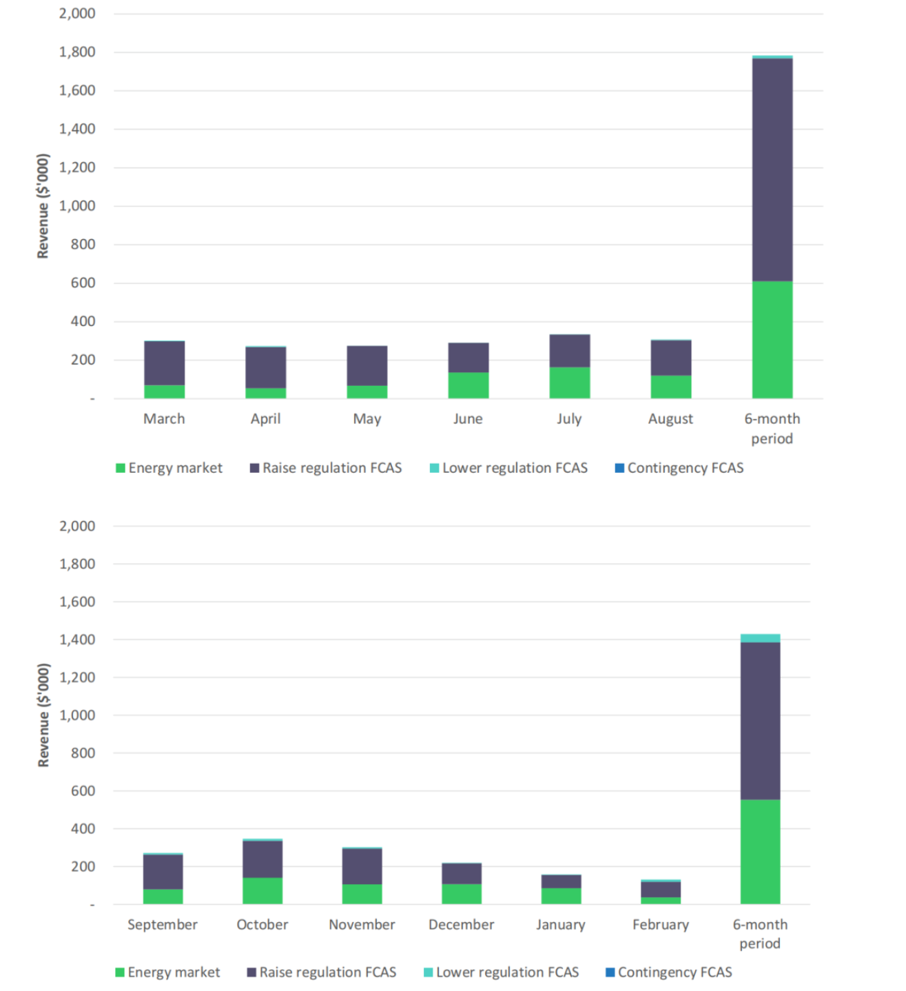 在運(yùn)營(yíng)的第二年,頻率調(diào)節(jié)收入與運(yùn)營(yíng)第一年相比有所下降,2020 年 7 月至 2021 年 2 月期間 FCAS 收入平均每月約 15 萬澳元,而 2019 年 7 月至 2020 年 2 月期間每月平均收入約 50 萬澳元。