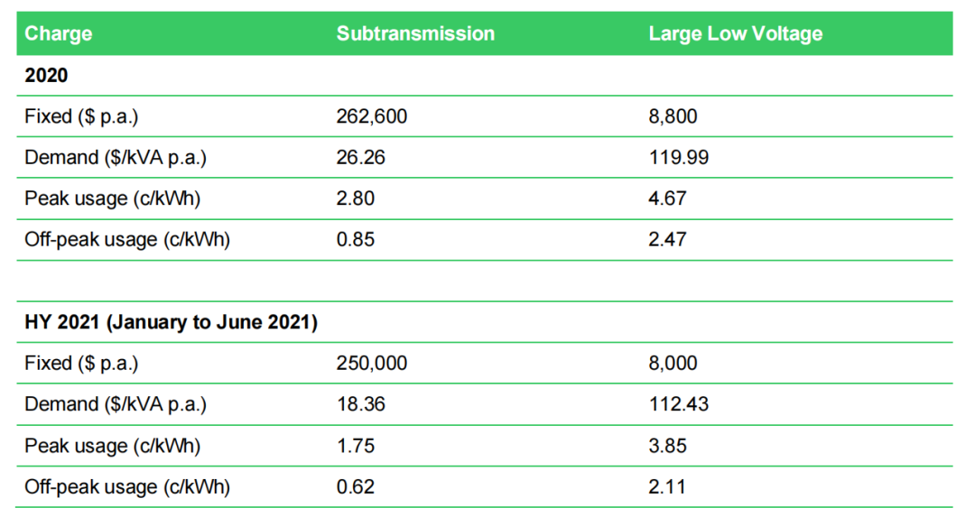 正如之前報(bào)告提及,向 Powercor 注冊(cè) GSF 和 GESS 電網(wǎng)接入需繳納 Powercor 征收的 DUOS 費(fèi)用。由于 GESS 是主要負(fù)荷源,因此大部分 DUOS 費(fèi)用都會(huì)流向 GESS。分配給組合系統(tǒng)的DUOS 是子輸電類別(ST),通常為子輸電客戶(而不是發(fā)電機(jī)組)使用。在連接 GESS 之前,GSF 僅受大型低壓(LLV)電價(jià)等級(jí)的約束,其中輔助功耗的最大夜間負(fù)載較低(約為 150kW),因此這不是材料成本的負(fù)擔(dān)。相比之下,現(xiàn)在對(duì) GESS 征收的固定費(fèi)用和需量費(fèi)用相當(dāng)可觀。表 4 概述了 2020 年和 2021 年上半年適用的每個(gè) ST 和 LLV Powercor 費(fèi)率類別的費(fèi)用。