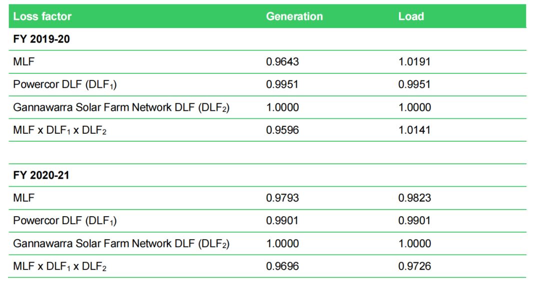 將 GESS 的線損應(yīng)用到 區(qū)域參考節(jié)點(diǎn)(RRN ) 的參考結(jié)算中,須遵守一項(xiàng) MLF 和兩項(xiàng) DLF——一項(xiàng)用于 Gannawarra 光伏電站內(nèi)部配網(wǎng),一項(xiàng)用于 Powercor 的配網(wǎng)(Reference NMI: 6203935735 with DLF code KGS)——用于其發(fā)電和負(fù)荷。鑒于 Powercor 電網(wǎng)接入點(diǎn)與 GESS 計(jì)量點(diǎn)之間的電氣距離較短,AER 確定 DLF 為 1.0 適用于 Gannawarra 光伏電站內(nèi)部配網(wǎng)。截至2020年6月和2021年6月的財(cái)政年度的MLF和DLF如表3所示。