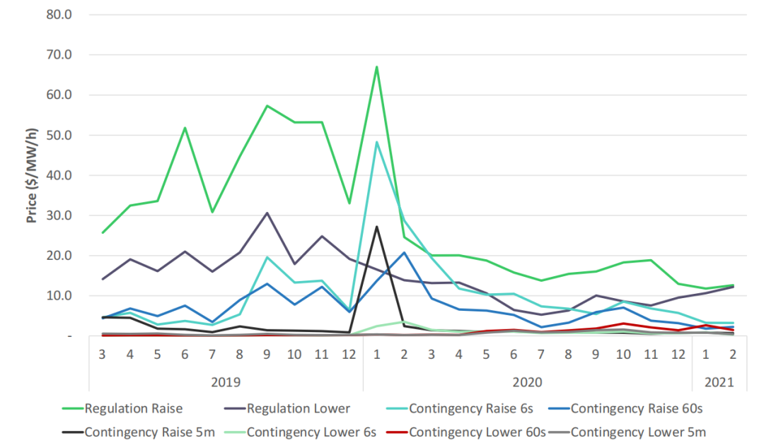 圖 6 按月和服務(wù)劃分的 FCAS 平均價(jià)格區(qū)間:2019 年 3 月至 2021 年 2 月