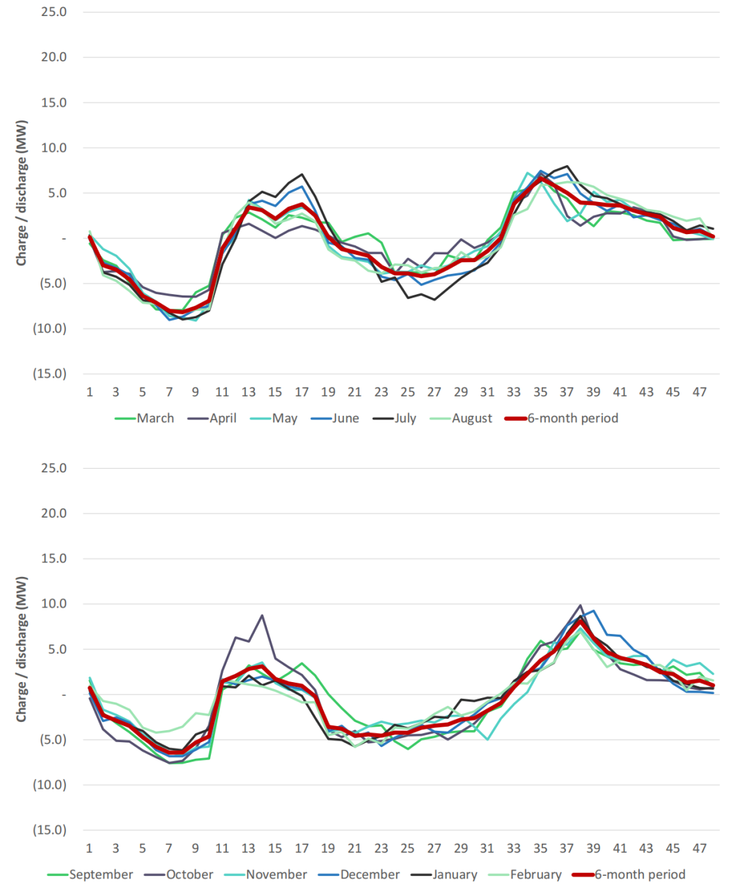 從能源市場(chǎng)的角度來看,圖 4 和圖 5 分別概述了 GESS 第 2 年的平均運(yùn)營(yíng)狀況和維多利亞州交易時(shí)段的價(jià)格。GESS的運(yùn)營(yíng)策略與第一年基本沒有變化,即遵循能源市場(chǎng)價(jià)格,早晚高峰價(jià)格對(duì)應(yīng)一天中的兩種放電模式。正如第 2.2.2 節(jié)中進(jìn)一步討論的,GESS 主要在清晨充電,盡管這樣做會(huì)產(chǎn)生網(wǎng)絡(luò)使用費(fèi)用。