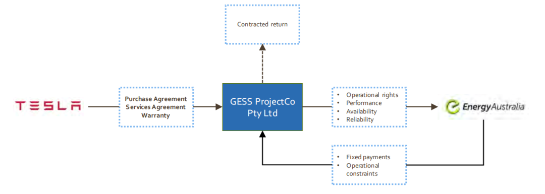 BSSA 還向 EnergyAustralia 提供電池性能、可用性和可靠性承諾,但須遵守運(yùn)營(yíng)限制,主要與循環(huán)次數(shù)和深度以及與共址的太陽能發(fā)電廠共享接入通道相關(guān)的調(diào)度容量限制。該電池采購(gòu)協(xié)議為 GESS 提供了特斯拉對(duì)性能、可用性和可靠性的承諾。圖 2 概述了這些安排。