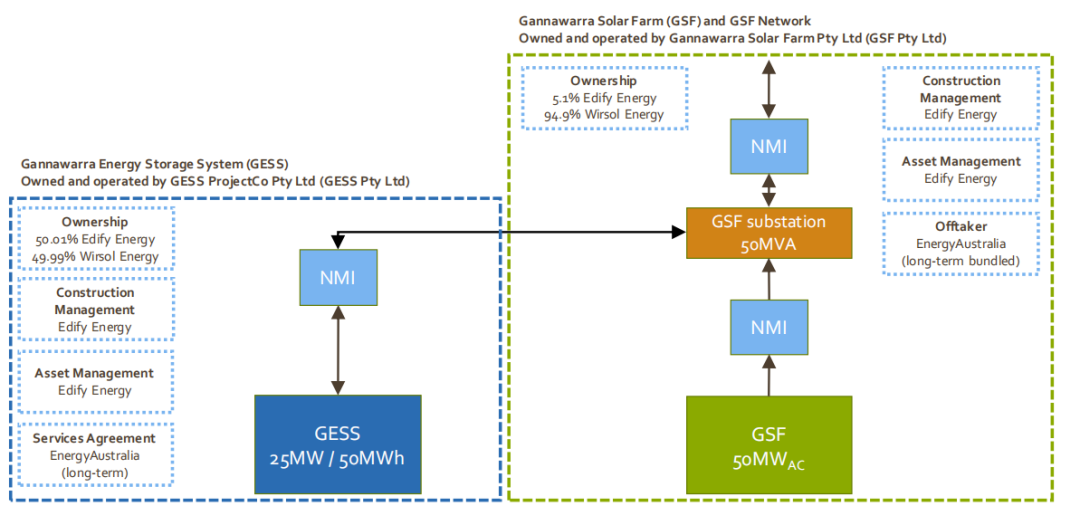 GESS的實(shí)踐給出了比較理想的一類實(shí)現(xiàn)方式,可再生能源電站發(fā)電量的承購(gòu)方和儲(chǔ)能電站的運(yùn)營(yíng)方為同一家公司( EnergyAustralia)??稍偕茉春蛢?chǔ)能電站的建設(shè)(Edify )與資產(chǎn)管理(Edify )的投資和管理來自同樣的公司(Edify & WIRCON)。