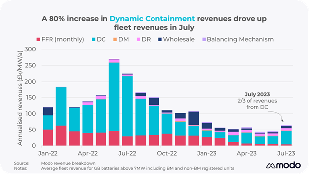 這一增長(zhǎng)來自動(dòng)態(tài)遏制輔助服務(wù),該服務(wù)在7月的收入比6月高出80%,占當(dāng)月儲(chǔ)能系統(tǒng)總收入的66%。