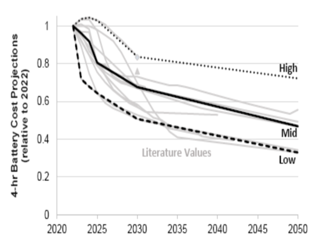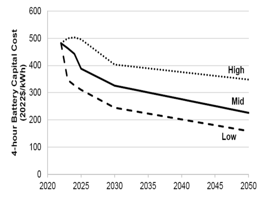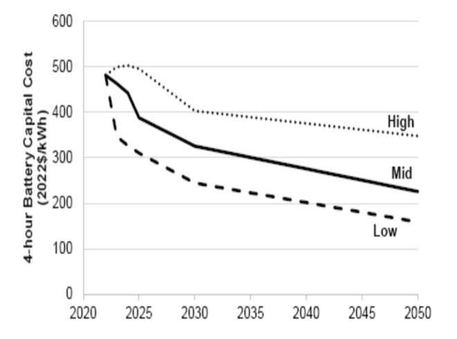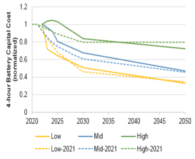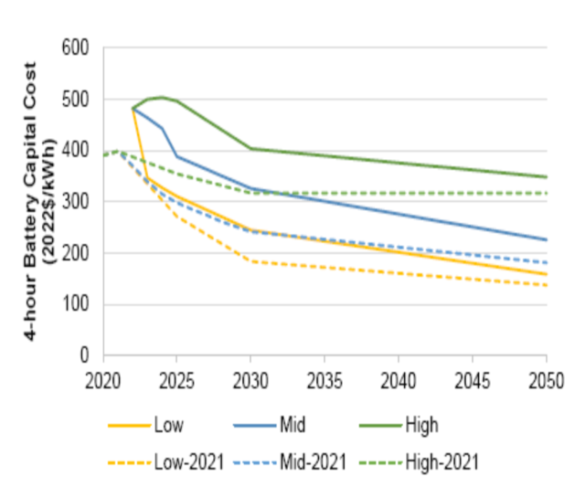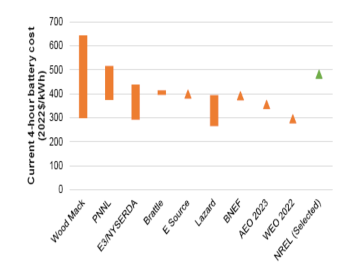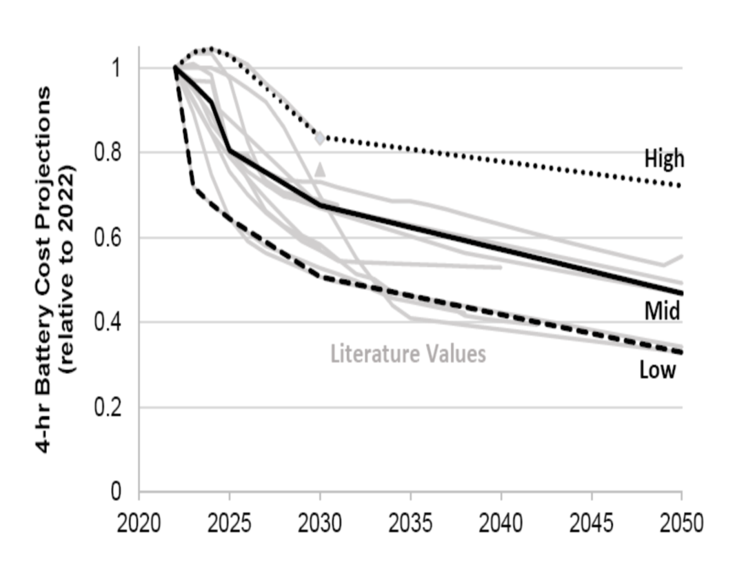 圖3.目前的電池儲(chǔ)能系統(tǒng)成本來(lái)自最近的研究報(bào)告,選擇NREL報(bào)告中的成本作為這項(xiàng)工作的2022年起始成本。
