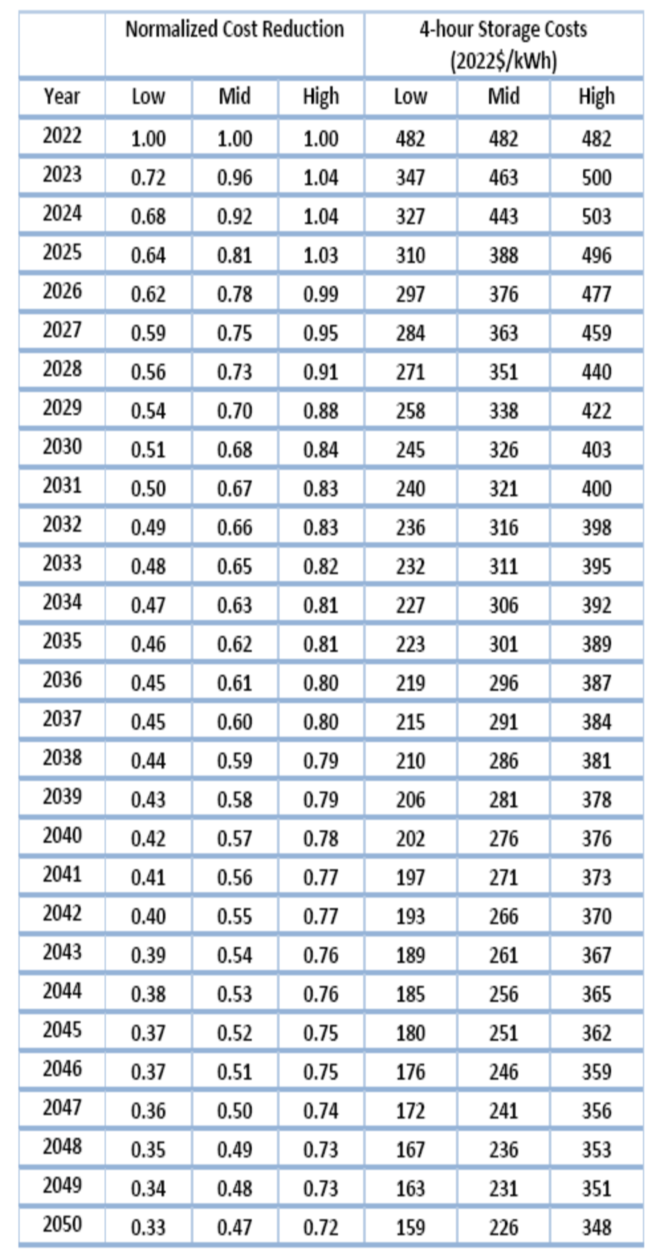 2025年、2030年和2050年之間的點(diǎn)是根據(jù)給定值的年份之間的線性值設(shè)置的。為了將這些標(biāo)準(zhǔn)化的低、中、高預(yù)測(cè)轉(zhuǎn)換為成本值,將電池儲(chǔ)能系統(tǒng)的標(biāo)準(zhǔn)化成本值乘以4小時(shí),得出4小時(shí)電池儲(chǔ)能系統(tǒng)的儲(chǔ)能容量成本。