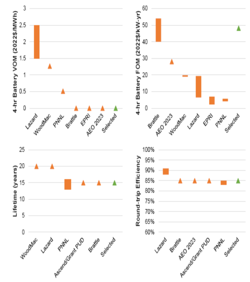圖6.來(lái)自各個(gè)研究報(bào)告中的VOM (右上)、FOM (左上)、生命周期(右下)和充放電效率(左下)。NREL的研究報(bào)告選擇的成本是所示的最右邊的值。