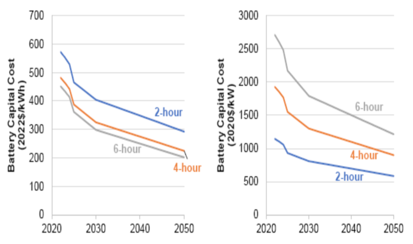 圖5使用中間成本預(yù)測(cè)的2小時(shí)、4小時(shí)和6小時(shí)電池的成本預(yù)測(cè)。左圖以美元/kWh為單位,右圖以美元/kW為單位。