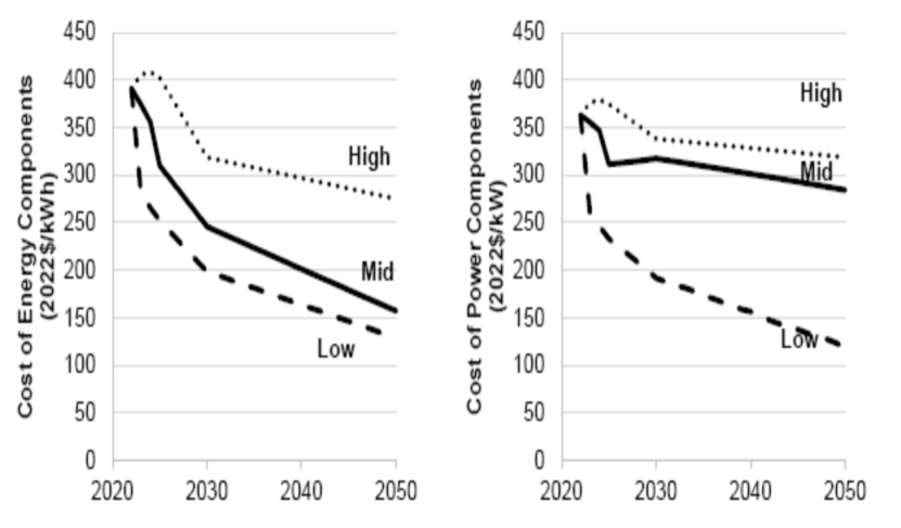 圖4顯示了電池儲(chǔ)能系統(tǒng)裝機(jī)容量和儲(chǔ)能容量的成本預(yù)測(cè)。這些組成部分結(jié)合起來(lái)就得到了一個(gè)總系統(tǒng)成本,其中儲(chǔ)能系統(tǒng)成本(單位為美元/kWh)是裝機(jī)容量部分成本乘以持續(xù)時(shí)間再加上儲(chǔ)能容量部分的成本。