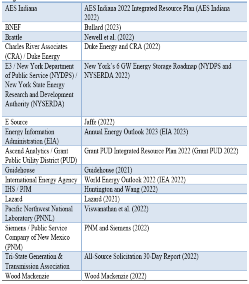 NREL的這份報(bào)告對(duì)于電池儲(chǔ)能系統(tǒng)的成本和性能預(yù)測(cè)使用基于一些研究報(bào)告的方法,其中預(yù)測(cè)通?;谶@些研究報(bào)告中的低值、中值和最高值。表1列出了在這項(xiàng)研究中提到的報(bào)告。由于電池儲(chǔ)能系統(tǒng)成本的快速變化和部署預(yù)期,NREL僅使用2022年和2023年發(fā)布的研究報(bào)告來(lái)進(jìn)行成本預(yù)測(cè)。除了參與表1中列出的報(bào)告之外,還參考了美國(guó)電力研究院(EPRI 2020)關(guān)于電池儲(chǔ)能系統(tǒng)運(yùn)營(yíng)和維護(hù)和性能假設(shè)的2020年報(bào)告,但NREL沒(méi)有使用他們的成本預(yù)測(cè),因?yàn)槠鋱?bào)告是在2022年之前發(fā)布的。