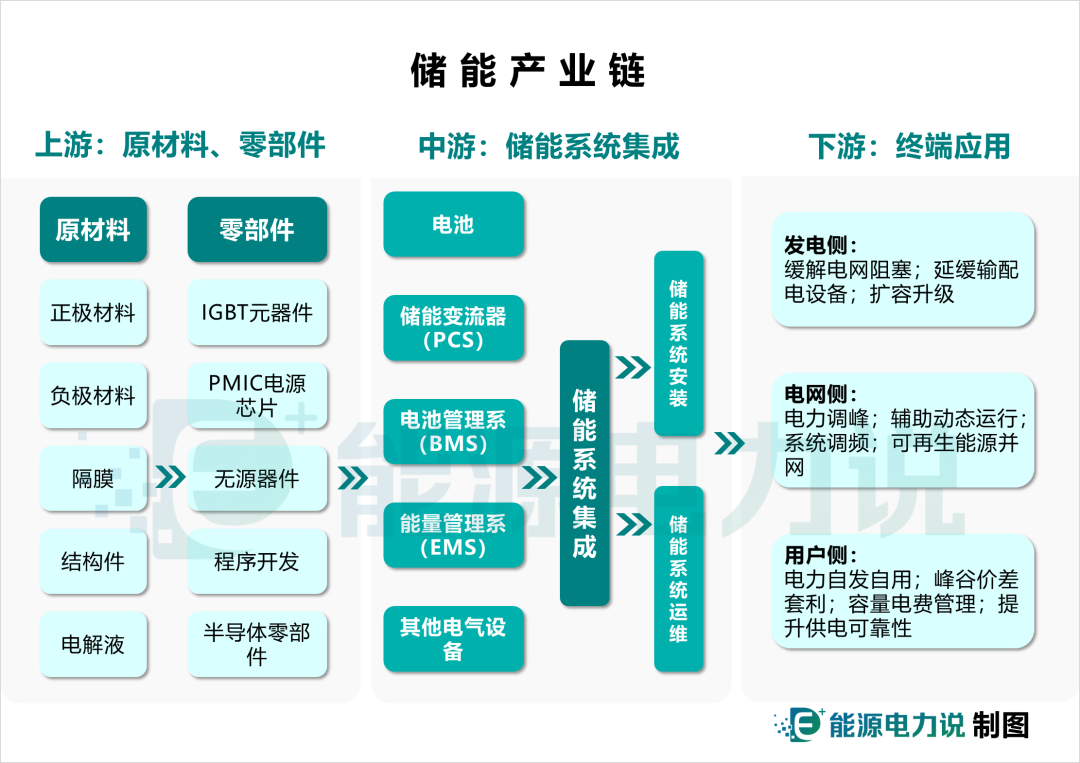中國儲(chǔ)能網(wǎng)訊:從電化學(xué)儲(chǔ)能系統(tǒng)產(chǎn)業(yè)鏈來看,上游是電池原材料、電子元器件供應(yīng)商等;中游是儲(chǔ)能系統(tǒng)集成;下游應(yīng)用端則是風(fēng)光電站、電網(wǎng)系統(tǒng)、戶用/工商業(yè)、通信運(yùn)營商、數(shù)據(jù)中心等終端用戶。一個(gè)典型的電化學(xué)儲(chǔ)能系統(tǒng)主要由電池、儲(chǔ)能變流器(PCS)、電池管理系統(tǒng)(BMS)、能量管理系統(tǒng)(EMS)四個(gè)核心部分構(gòu)成。